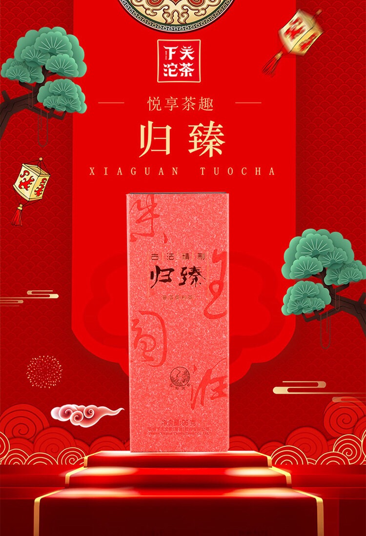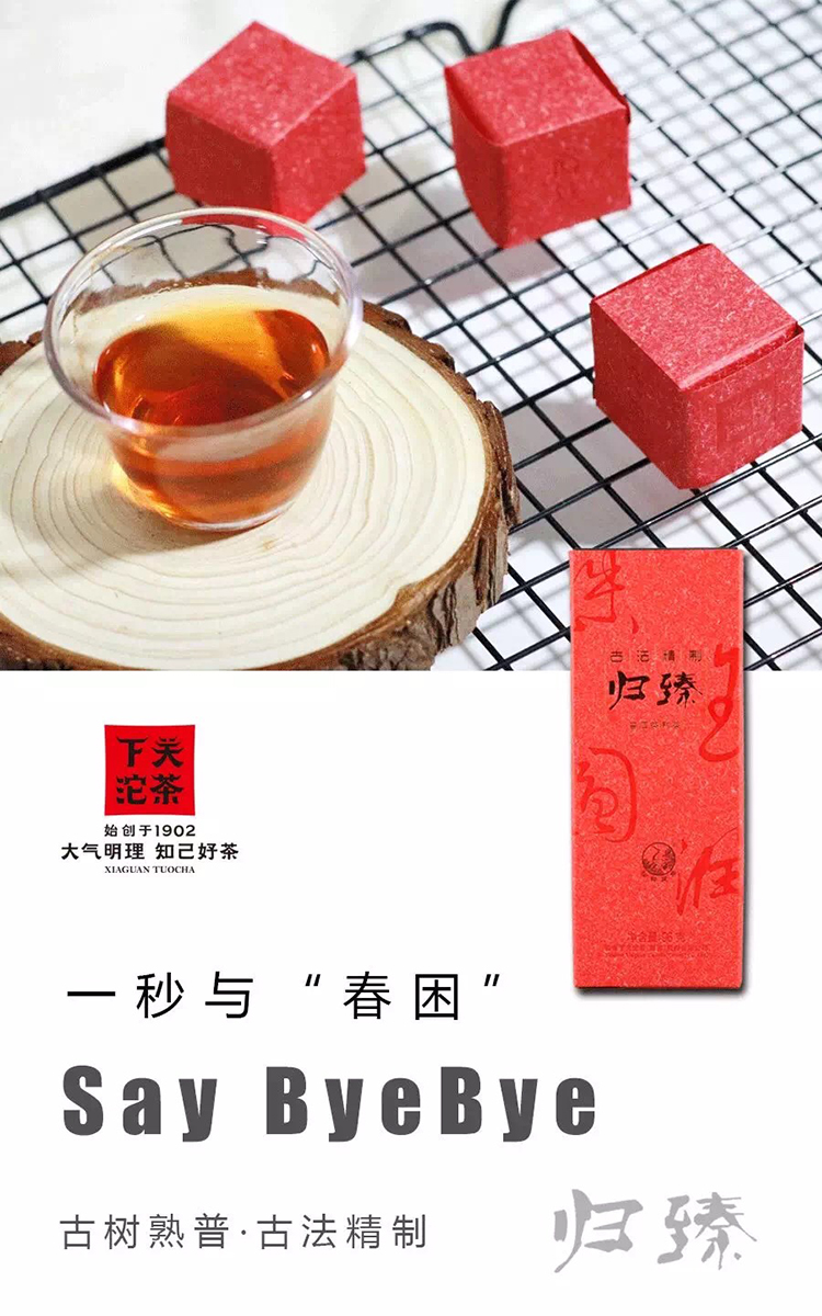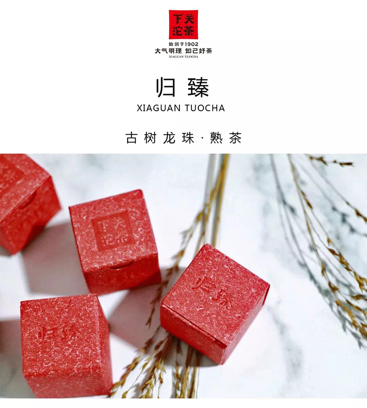 山头古树原料,结合下关沱茶熟茶制作工艺,轻水,低温发酵,研制出全新口感的古树熟茶——归臻。相较其他大量淋水的高温发酵方式,轻水熟茶发酵工艺让熟茶口感更佳,陈香可口,柔滑甘甜,更容易接受。