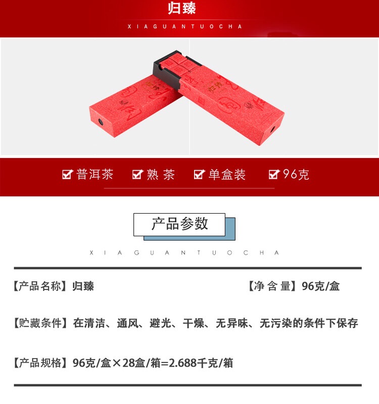 归臻熟茶优选勐库茶区、邦东茶区的优质古树晒青毛茶为原料,经下关沱茶经典的发酵技艺精制而成。