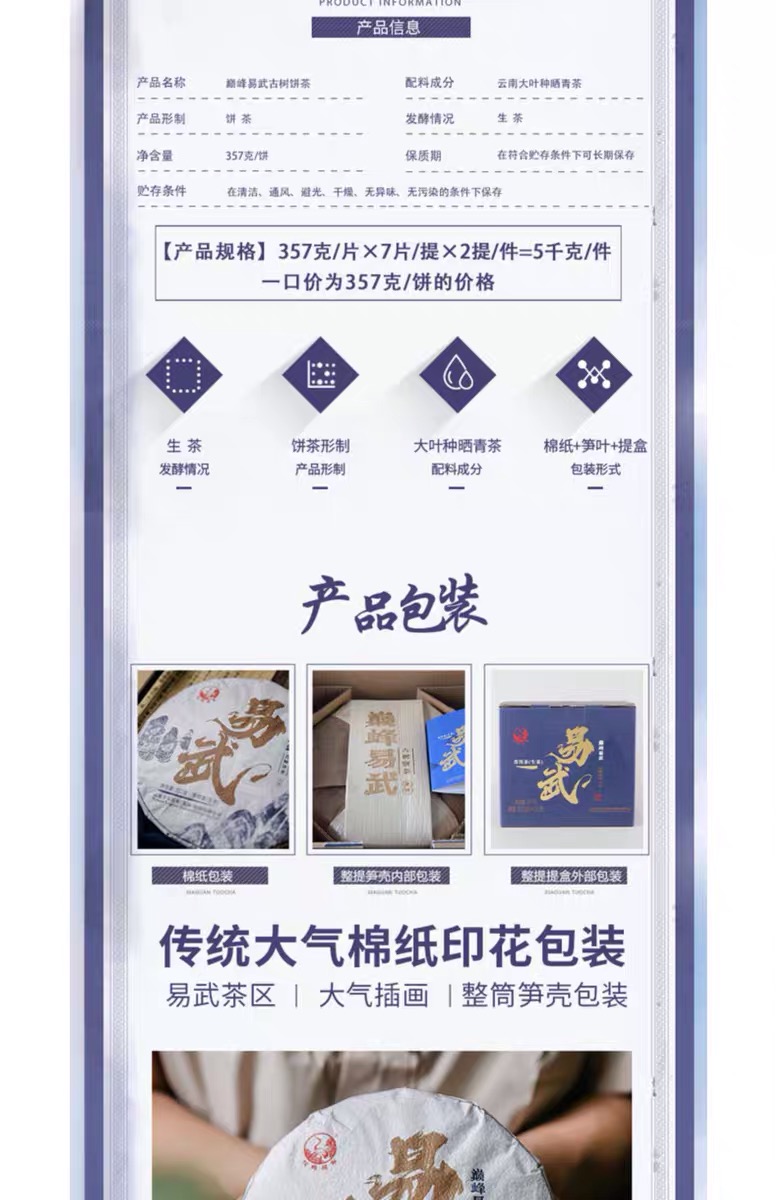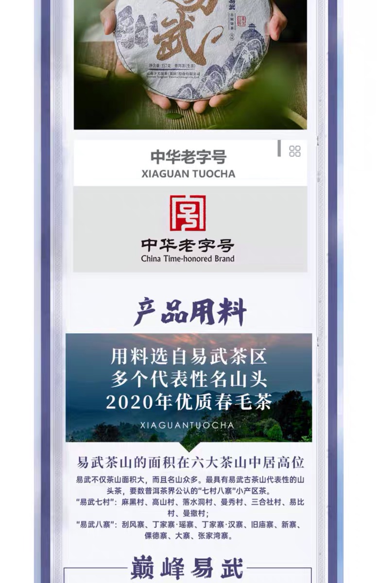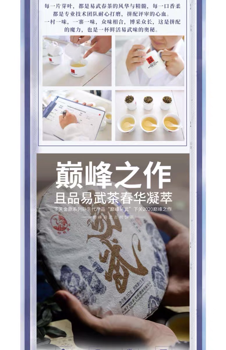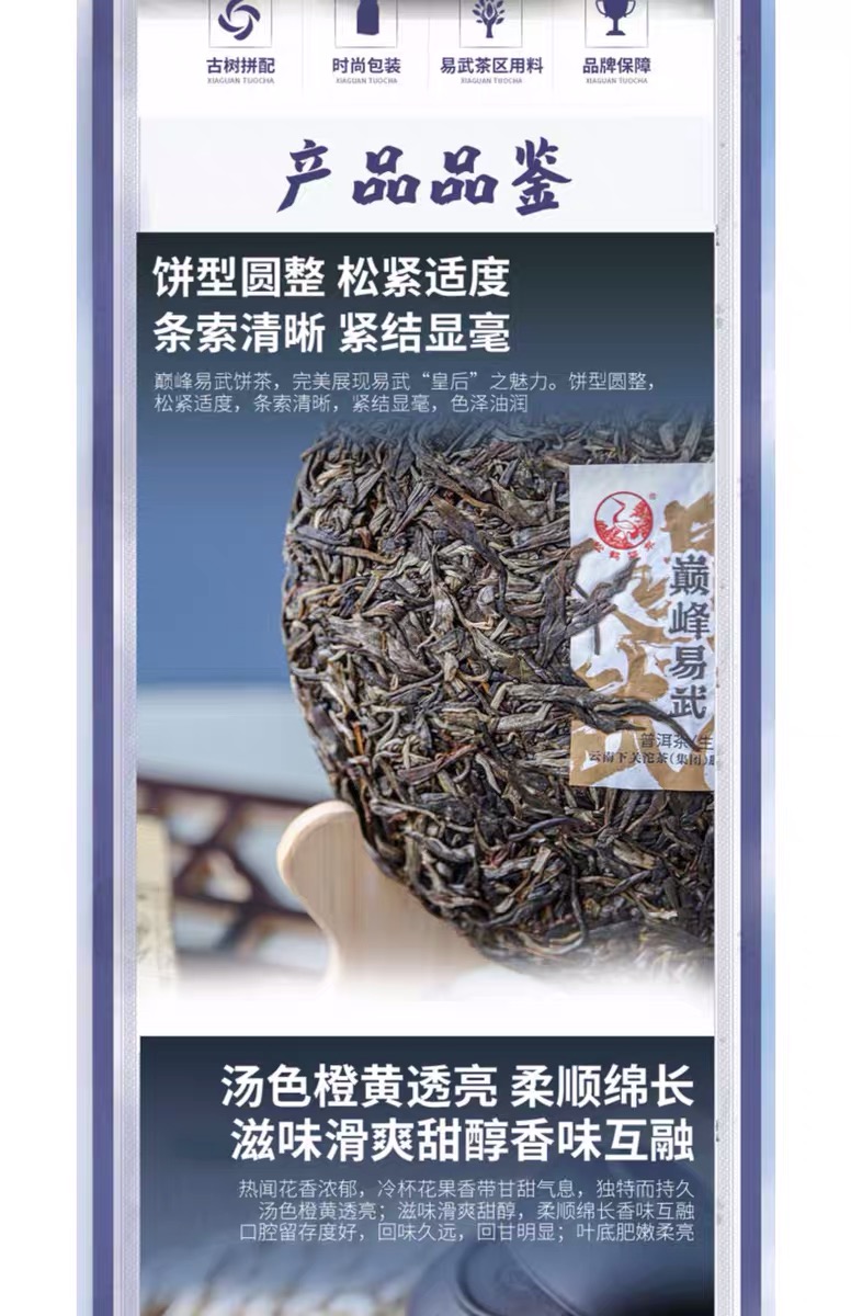 巅峰易武,且品易武茶春华凝萃 饼型圆整,松紧适度,条索清晰,紧结显毫,色泽油润; 热闻花香浓郁,冷杯花果香带甘甜气息,独特而持久;汤色橙黄沏亮; 滋味滑爽甜醇,柔顺绵长,香味互融,口腔留存度好,...