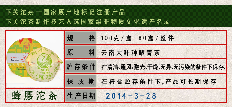蜂腰沱茶系选用云南大叶种上等茶青作原料,通过高温蒸压而成,造型优美,芽肥叶壮,白毫显露,汤色澄黄明亮,香气清香高纯、滋味醇厚鲜爽,具有回甘之特点。在取得出口食品生产企业备案证明的基础上,经严格质量鉴定、理化检验、农残测定,各项指标均符合国家食品卫生安全要求,是一种良好的保健饮料。